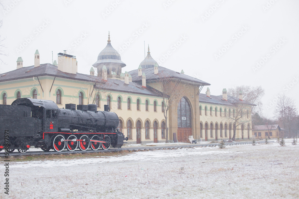 Historic steam locomotive. It is exhibited in front of the old railway station.