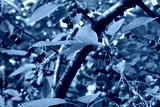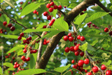 Red ripe cherry fruits on branch ready to be harvested in the orchard.at dawn. Prunus avium on springtime