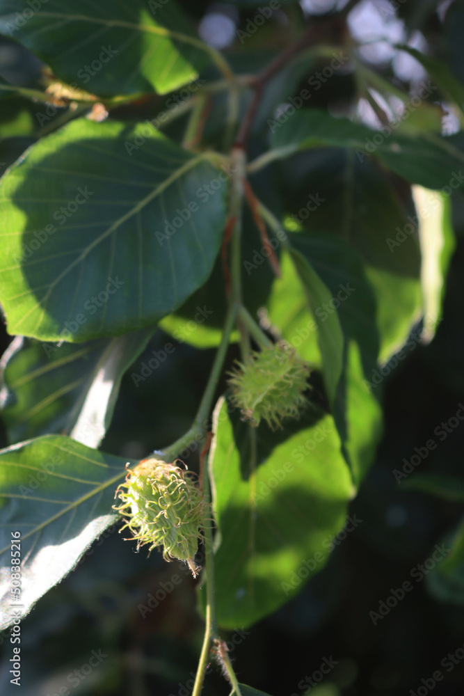 European or Common beech tree with prickly green unripe fruits on springtime season. Fagus sylvatica