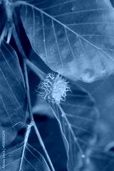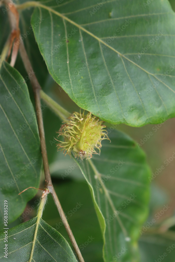 European or Common beech tree with prickly green unripe fruits on springtime season. Fagus sylvatica