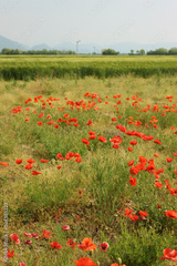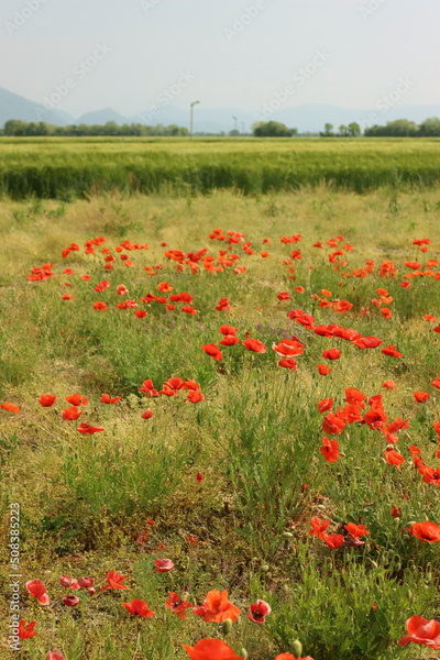 Green Wheat field with red poppies in the italian countryside. Cultivated Triticum plants on springtime