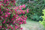 Weigelia bush in bloom with beautiful pink flowers in the garden on springtime
