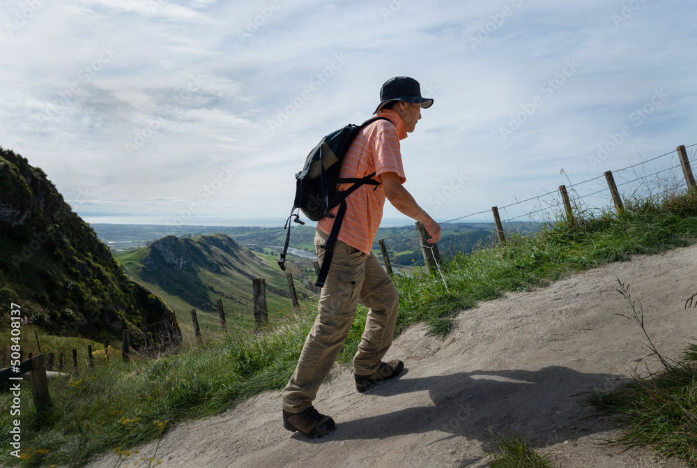 Hiking Te Mata Peak track. Climbing steep uphill, Hawke’s Bay.