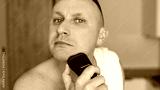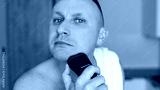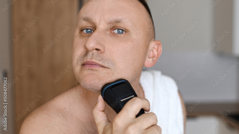 Daily routine male self-care. Handsome young unshaven man with towel on shoulders shaving with modern electric razor trimmer while looking at camera, indoors.