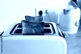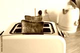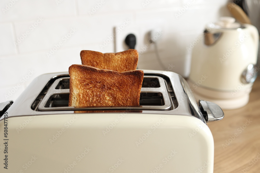 Modern white toaster and roasted bread slices toasts inside on wooden table in kitchen