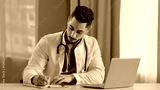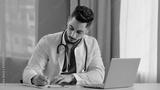 Concentrated arabian man doctor practitioner sit at clinic cabinet use computer chatting distant in medical social app give online consultation writing recipe prescription diagnose search information