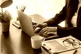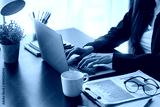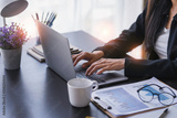 Close-up of businesswoman’s hand while working on her laptop at the office desk. student girl using laptop at home, online learning, internet marketing, working from home, office workplace