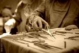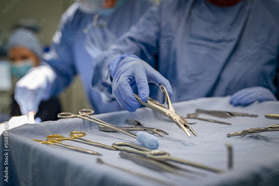Surgeon hand taking surgical tools from tray
