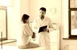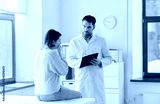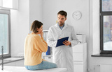 medicine, healthcare and people concept - male doctor with clipboard talking to scared or coughing woman patient at hospital