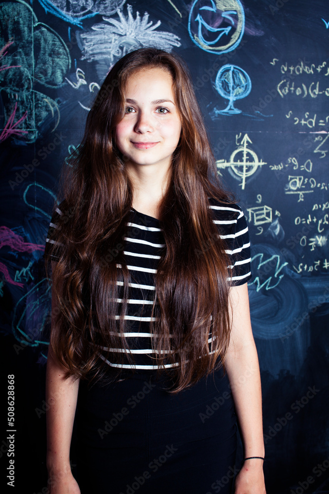 back to school after summer vacations, cute teen girl in classroom
