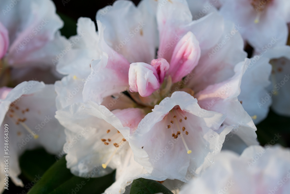 white and pink rhododendron flower closeup selective focus