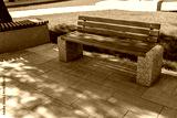 An empty wooden modern bench in the city square. A place of rest. Landscape architecture.
