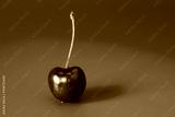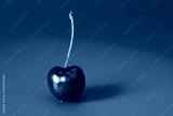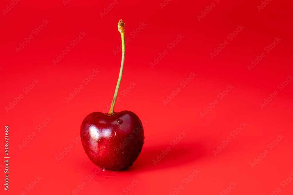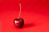 dark red ripe cherry or cherry berry with a stalk on a red background with