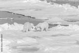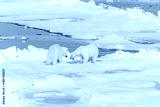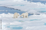 Two young wild polar bear cubs playing on pack ice in Arctic sea, north of Svalbard