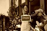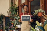Happy African American flower shop owner holding open sign and looking at camera.