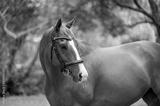 Portrait of chestnut horse wearing a bridle looking over shoulder in a forest green setting