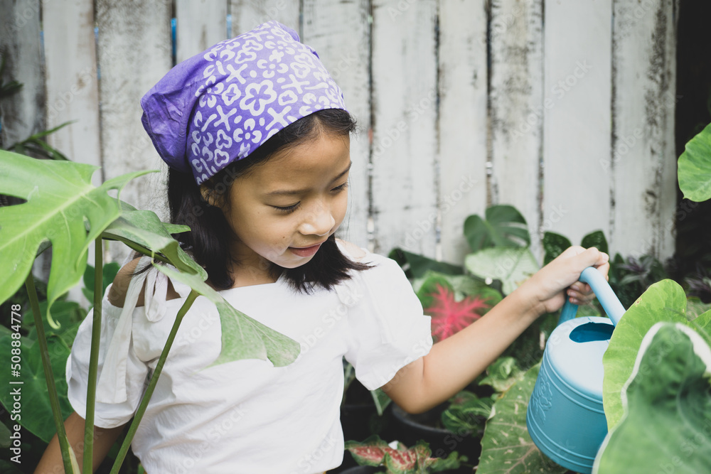 Potriat of adorable little asian girl taking care her plants on the garden.