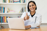Laughing latin american mature doctor showing thumb up