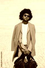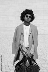 Portrait of African American man with leather bag. Handsome man in suit and coat looking at camera. Portrait, beauty concept