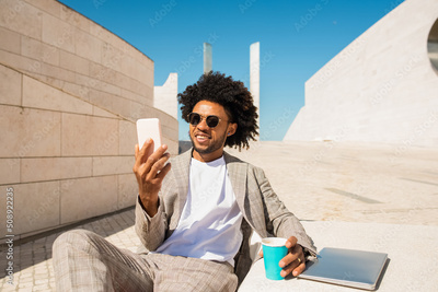Smiling African American man video calling in open air. Man in suit with beard holding mobile phone. Sitting at terrace or rooftops. Drinking coffee. Communication, technology concept