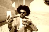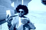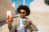 Content African American man video calling in open air. Man in suit with beard holding mobile phone. Sitting at terrace or rooftops. Drinking coffee. Communication, technology concept