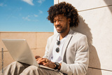 Casual African American man working in open air. Man in suit with beard using laptop. Sitting at terrace or rooftops. Working, manager, technology concept