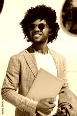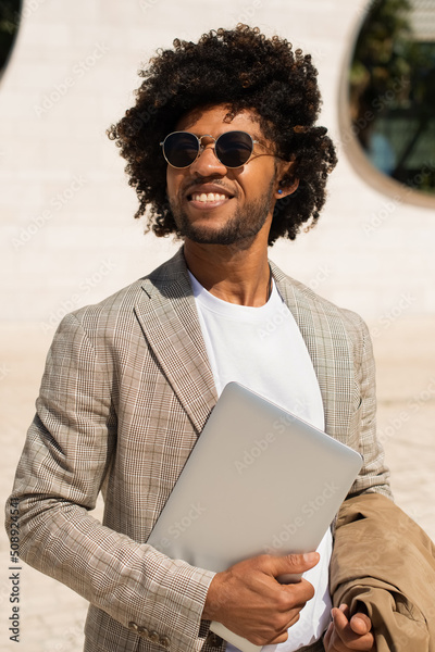 Beaming African American man outdoors. Man in suit with beard holding laptop, walking. Looking at camera. Portrait, city life concept