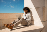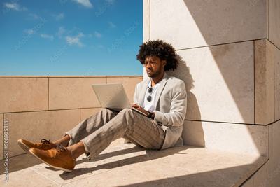 Cool African American man working in open air. Man in suit with beard using laptop. Sitting at terrace or rooftops. Working, manager, technology concept