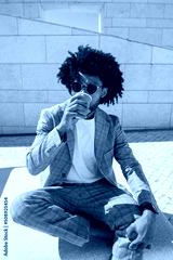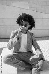 Portrait of good-looking African American man in open air. Man in suit with beard sitting at terrace or rooftops. Drinking coffee. Portrait, city life concept