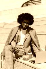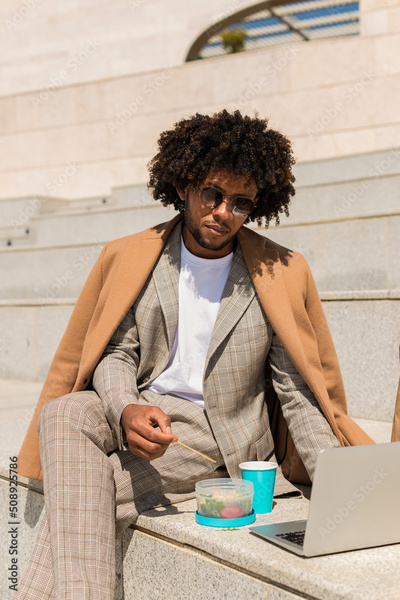 African American man having brunch. Man eating salad, drinking coffee while working. Meal, job concept