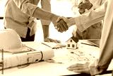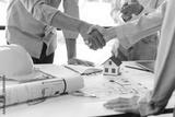 Architect and engineer construction workers shaking hands after successful collaboration. working site, Construction, contract between two companies structure concept