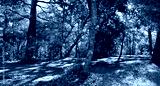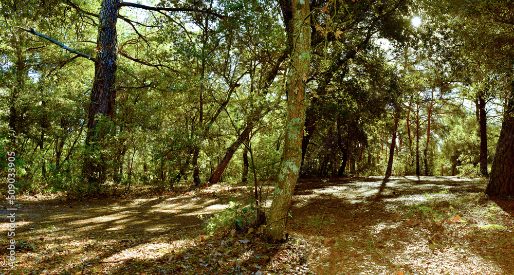 Wood of oaks and Aleppo pines in southern France. Path in the forest, natural wood, Mediterranean forest