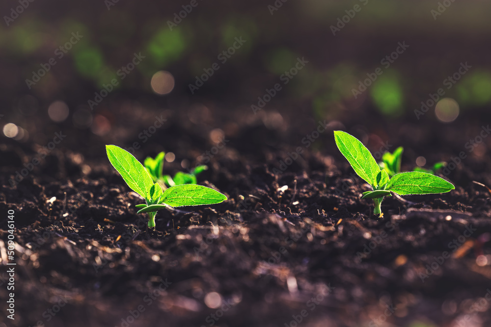 Green seedling in growth in ground. Planting seedlings. Organic vegetable plants in greenhouse. New life