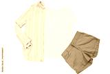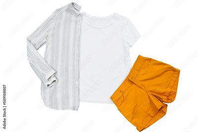 White closeup t shirt mock up flat lay isolated on white background. Summer accessories. Top view and copy space. Mockup t-shirt and summertime. Template blank shirt.