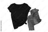 Summer black closeup t shirt mock up flat lay isolated on white background. Top view and copy space. Mockup t-shirt and summertime. Template blank shirt.