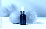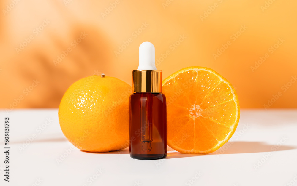 Serum bottle with dropper and slice of orange, ingredients for skin care and treatment vitamin on white background, Natural cosmetics concept.