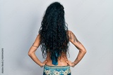 Young woman wearing bindi and traditional belly dance clothes standing backwards looking away with arms on body