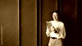 Writes a message in a chat a woman with glasses works uses a tablet in an office in a coworking space