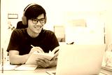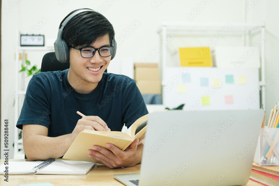 Young man study in front of the laptop computer at home