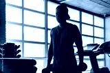 Silhouette picture of a man performing exercises with dumbbells in the gym. Strength training