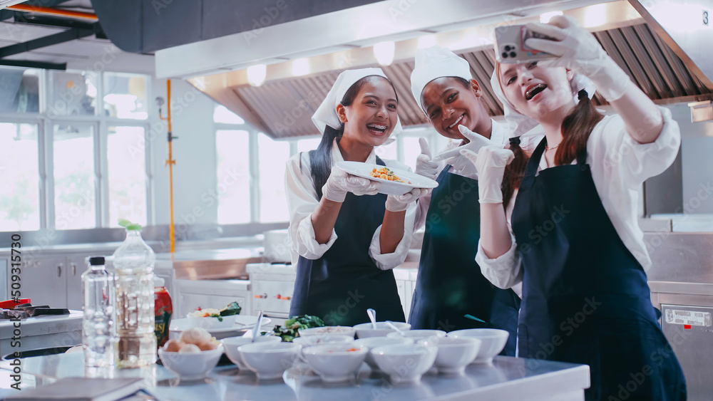 Group of schoolgirls having fun learning to cook. Female students in a cooking class.
