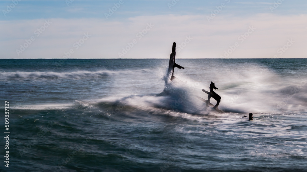 Waves splashing on the shipwrecks of Gairloch, Taranaki, New Zealand.