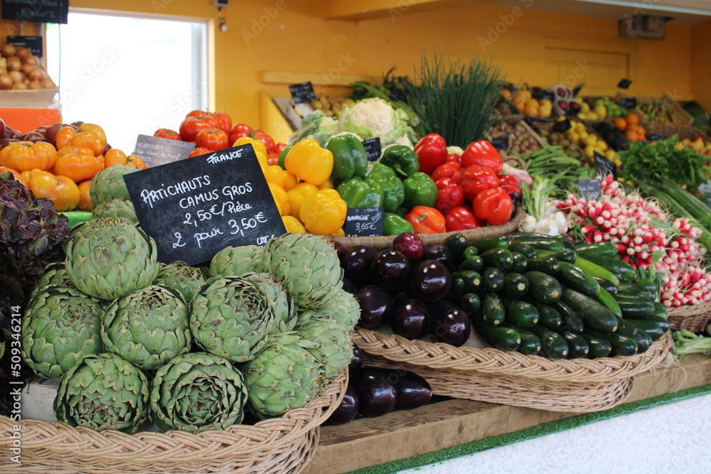 Stand, étal de fruits et légumes sur le marché, artichauts, courgettes, poivrons, radis, tomates