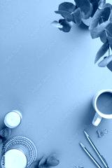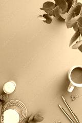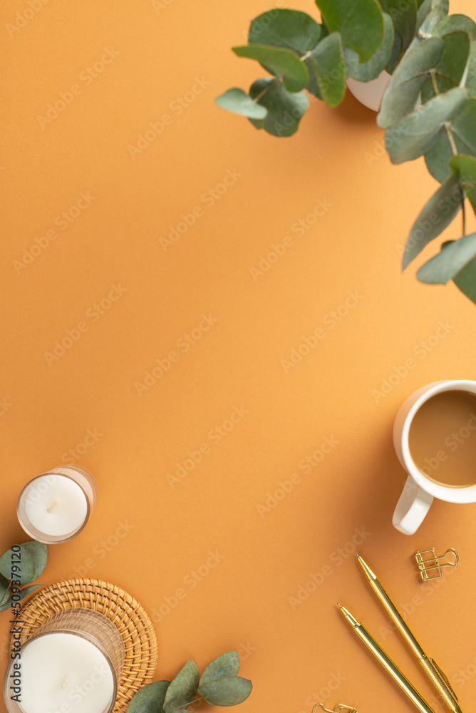 Business concept. Top view vertical photo of workspace cup of coffee gold pens binder clips candles on rattan serving mat and vase with eucalyptus on isolated orange background with copyspace
