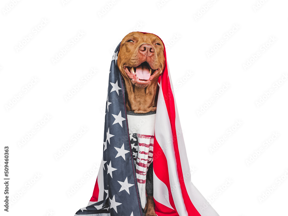 Lovable, pretty dog and American Flag. Closeup, indoors. Studio photo. Congratulations for family, loved ones, relatives, friends and colleagues. Pets care concept