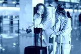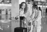 Airport Terminal: smily beautiful mother and cute child girl wait for their Vacation Flight Boarding, Looking at each other. Family with their passports and suitcases . Travelling Together.copy space