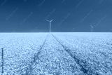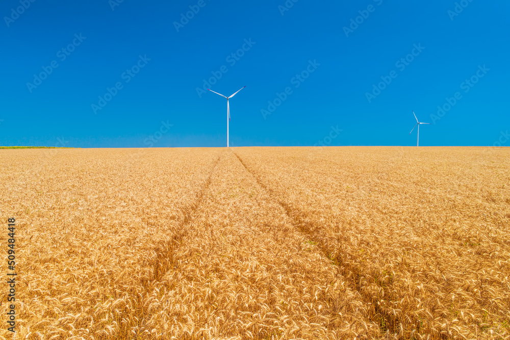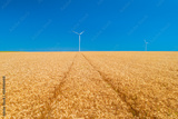 Blue sky and golden wheat field with wind turbines generating electricity, agriculture and technology