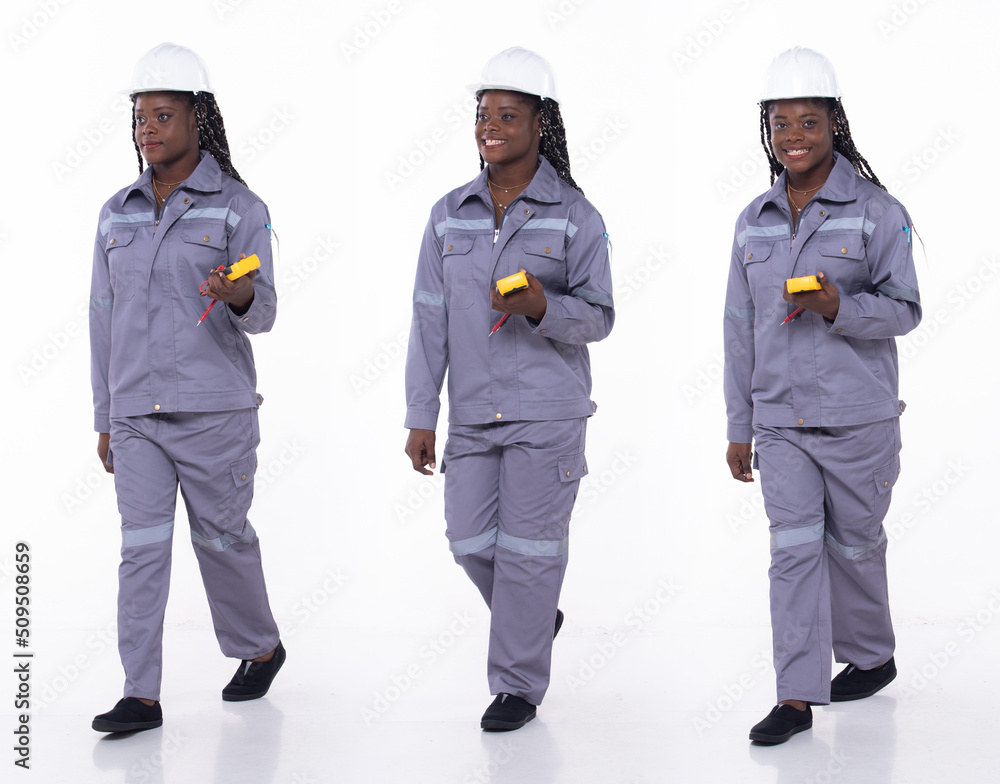 Full length 20s young African American Woman Industrial electrician, walking forward left right