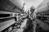 Engineer under inspection and checking construction process railway oil train and checking work on railroad station .Engineer wearing safety uniform and safety helmet in work.