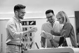 Portrait of salesman helping to people to buy a new digital device in tech shop